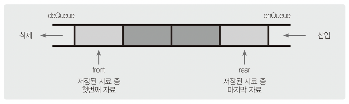 스택과는 달리 데이터가 삽입되는 곳과 삭제되는 곳이 다른 자료구조